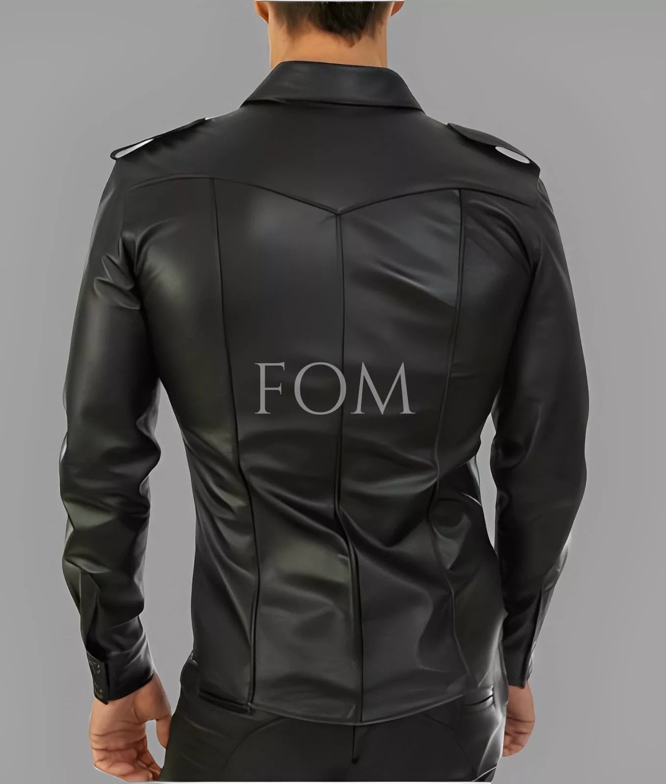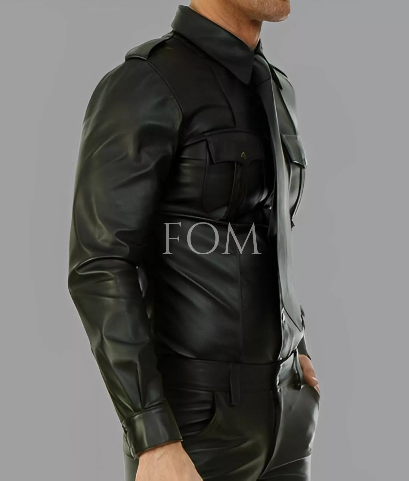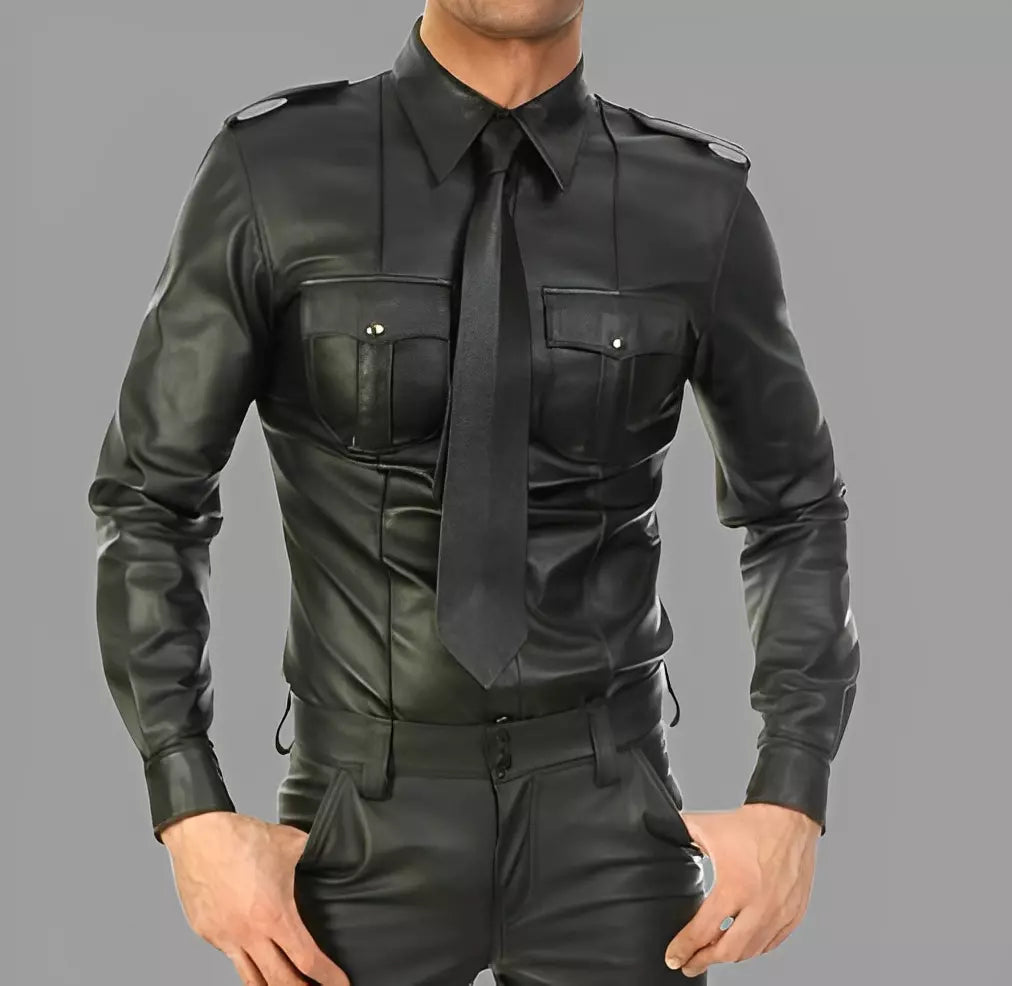 Crafted from genuine leather, this long sleeve shirt features chest flap pockets and shoulder epaulettes for a stylish police-style look. Designed with snap button fastening and lined with polyester, this shirt provides both functionality and comfort for any occasion. Expertly crafted for a sharp and polished appearance.